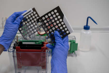 Laboratory DNA testing. 96-well plate on the background of the image of electrophoresis.