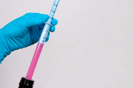 Medical laboratory. A hand in a medical glove pours a clear liquid from one test tube into another. Laboratory tests. Close-up.
