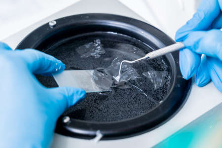 Close up woman hand in a rubber gloves put sample in a glass vial with blue cap into the autosampler rack in HPLC system. High performance liquid chromatography for separation compounds . Scientific and research work at chemical or clinical laboratory