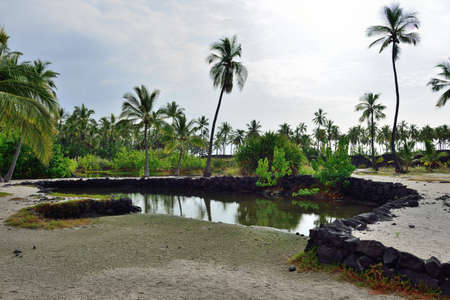 Heleipalala - Springwater and saltwater pond held fish to be eaten by the Hawaiian Royalty made with lava rocks and surrounded by coconut trees and sandy paths. At Pu'uhonua o Honaunau - Place of Refuge, a National Historical Park on the Big Island in Ha