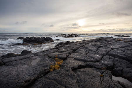 Coastal view on the Big Island of Hawaii with lava rocks at sunset