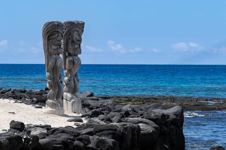 Two Wooden Tikis in the place of refuge (Honaunau) sanctuary, on the Big Island of Hawaii. Standing in white sand with a black lava barrier wall; Pacific ocean and blue sky are in the background.