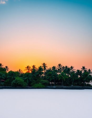 A scenic view captures a tranquil ocean with palm trees silhouetted against a vibrant sunset sky. The composition emphasizes the water's surface, reflecting the colorful sky, enhanced by the silhouettes of the trees. Suitable for various projects including travel and environmental themes.