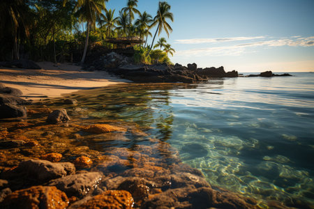 Hawaiian beach with palm trees and lava rocks. Beautiful island sunset by the ocean. Tropical travel vacation.