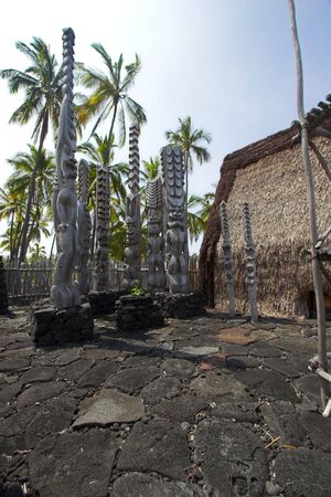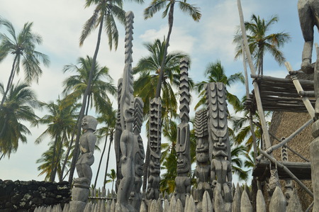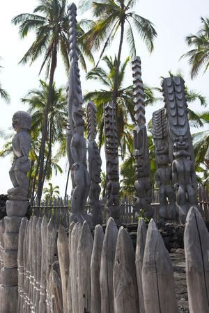 Religious statues of Hawaii's native polynesian people in Puauhonua o Honaunau National Historical Park on Big Island, Hawaii