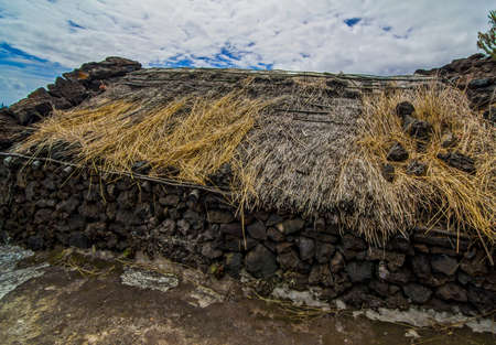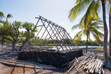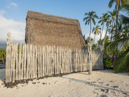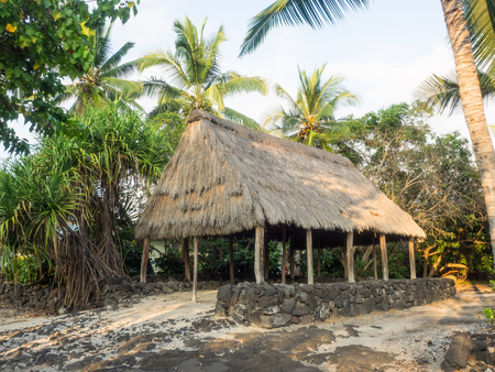 Hawaiian thatched roof dwellings at ancient Hawaiian site Pu'uhonua O Honaunau National Historical Park on Big Island, Hawaii
