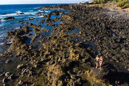 The couple stands on Rough rock formations near the ocean on the island of Tenerife.The Canary Islands.Tenerife.Spain.