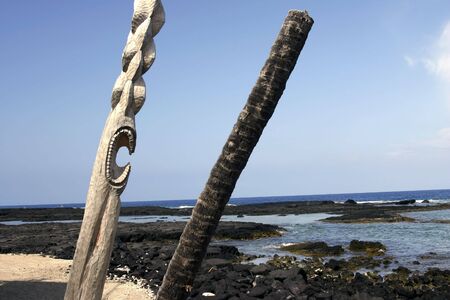 Two wooden hawaiian carvings look out over the blue waters of Honaunau Bay at the Puuhonuaa O Honaunau National Historical Park on the Big Island of Hawaii.