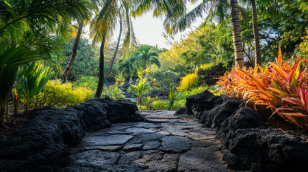 Dark volcanic rock platform surrounded by tropical plants, creating a rich contrast with vibrant vegetation. generative ai