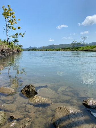 Captivating landscape featuring a flowing river bordered by lush hills under a dramatic sky. Ideal for nature lovers seeking tranquility and beauty.