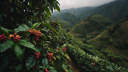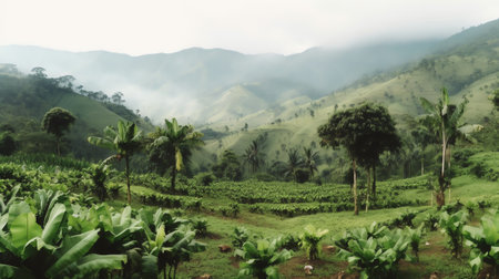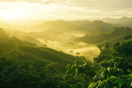 Stunning view of green coffee plantations on hills, with morning mist and warm sunlight creating a serene atmosphere.