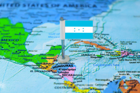 Honduras flag on a map. Close up. Selective focus.