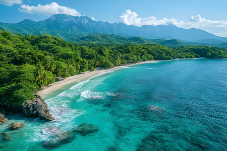 A breathtaking view of a tropical beach framed by lush greenery and majestic mountains. the turquoise waves gently lap the shore, creating a tranquil and inviting atmosphere perfect for relaxation and exploration. Generative AI