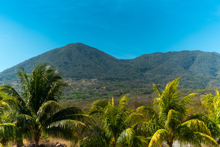 Scenic view of hills covered with vegetation in San Miguel, El Salvador, with tropical palm trees in the foreground under a clear blue sky.