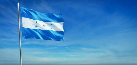 The National flag of Honduras blowing in the wind in front of a clear blue sky