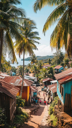 A vibrant coastal village features colorful houses nestled among palm trees, with locals walking along a winding path towards the sea under a bright blue sky.