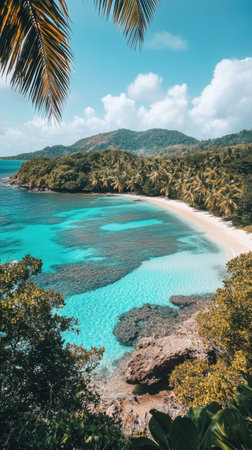 Tranquil and serene tropical beach paradise with secluded sandy beaches, lush greenery, and palm trees for a perfect vacation destination