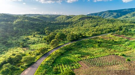 Explore this stunning aerial view showcasing a winding road through lush greenery and hills, capturing the essence of serene natural beauty and adventure.