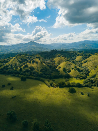 A vertical shot of hills covered in greenery under the sunlight and a blue cloudy sky