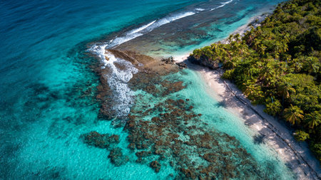 Aerial view of beautiful beach with turquoise water and coral reef
