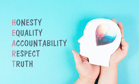 Holding a head with a colorful heart in the hands, symbol for honesty, equality, accountability, respect and truth
