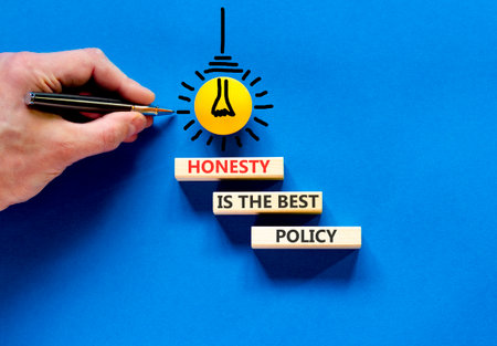 Honesty is the best policy. Concept words Honesty is the best policy on beautiful wooden blocks. Beautiful blue background. Business honesty is the best policy concept. Copy space.