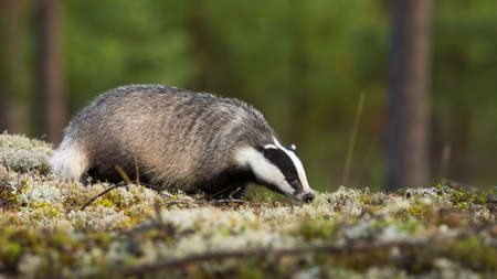 Badger in forest, animal nature habitat, Germany, Europe. Wildlife scene. Wild Badger, Meles meles, animal in wood. European badger, autumn pine green forest. Mammal environment, wide angle lens.