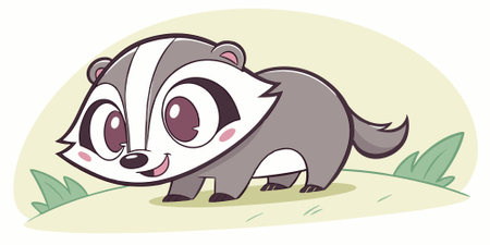 Cute forest animal, furry badger. Happy woodland fluffy brock with nice fur walk, watch. Funny and fuzzy and kind beast, kid and childish style. Flat isolated vector illustration on white background