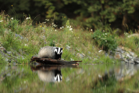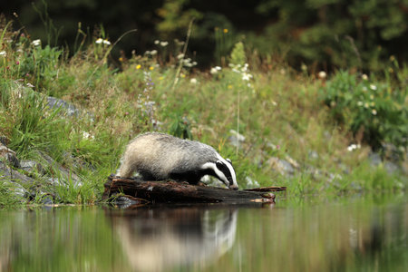 Badger in edge of forest on meadow, animal in nature habitat. Wild Badger, Meles meles. Mammal in environment during late summer day.