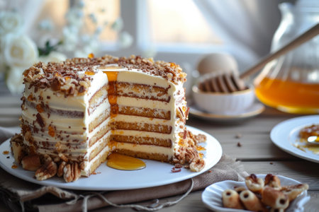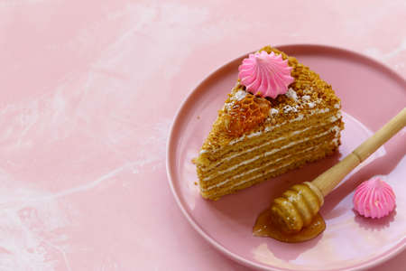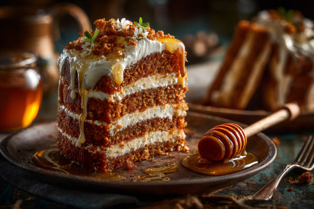Close Up of Delicious Honey Cake Slice with Honey Drip on Plate, Sweet Dessert on Rustic Table