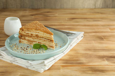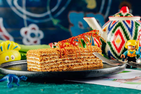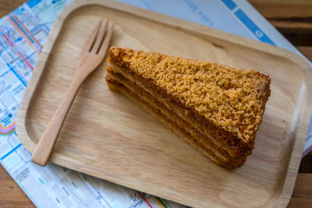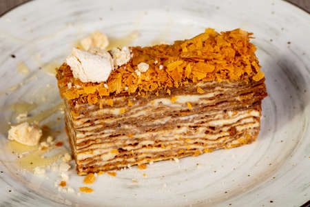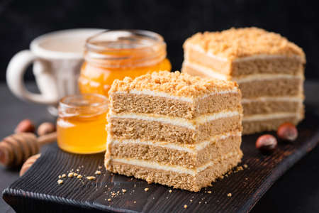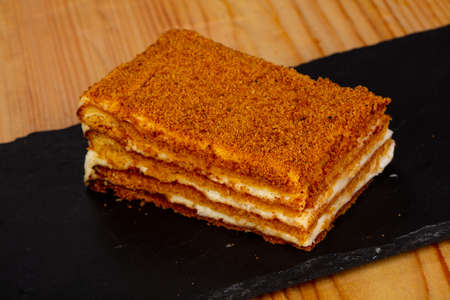 Square slice of layer honey cake Medovik. Russian cake served on a black wooden board