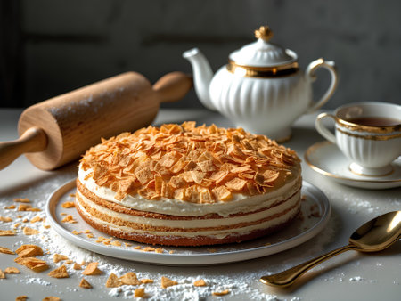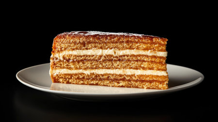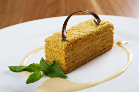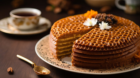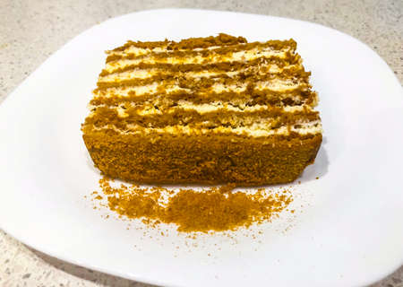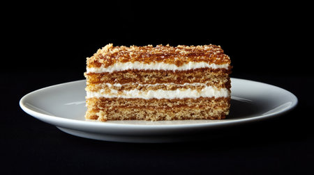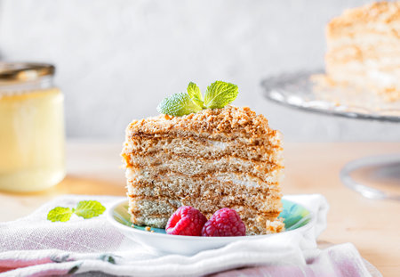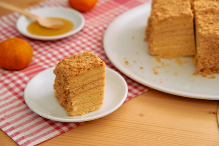 A beautifully presented slice of layered honey cake showcasing its delectable textures and creamy filling, perfect for dessert lovers and special occasions.
