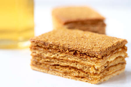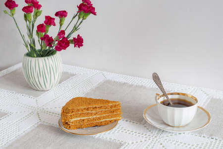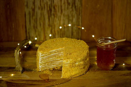 Slice of layered honey cake. A rosette with honey, a glass of cool white wine and a cup of thick aromatic tea. Selective focus.