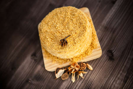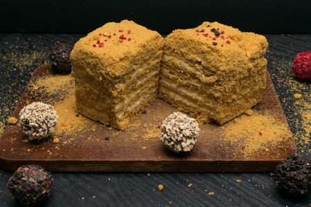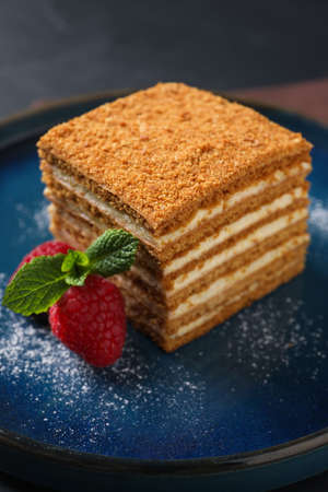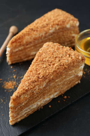 Layer honey cake Medovik on a black serving board. Closeup view. Sweet food