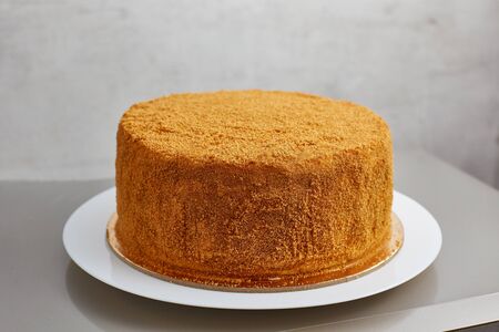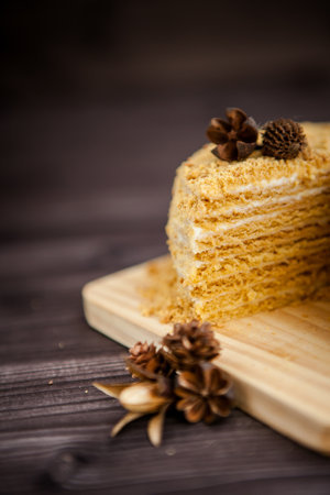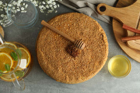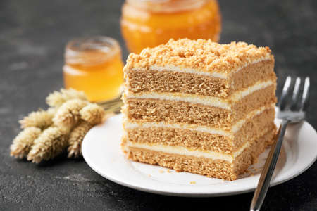 Delicious fresh sweet honey cake layer cake with white cream on textured concrete background