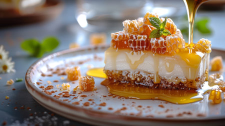 Gourmet dessert drizzled with honey and honeycomb pieces