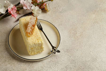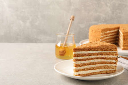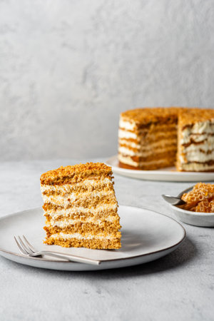 Traditional Russian Medovik. Piece of honey cake on a plate with cutlery on a concrete with honeycombs and a cake on the background. copyspace.