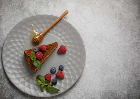 Slice of honey cake decorated with raspberries and blueberries with fresh mint leaves. Top view on gray background. Content for food bloggers with copy space. High quality photo