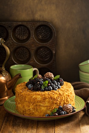 Piece of honey cake Medovik, layer cake decorated with berries on light background
