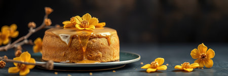 Delicious homemade cake with golden drizzle and flowers on a dark background
