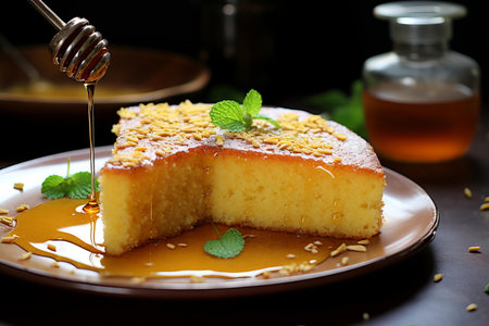 Moist Semolina cake honey spoon plate. Delicious arabic table muslim food. Generate Ai