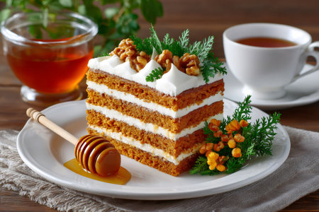 Layered honey cake with cream cheese frosting, walnuts, and greens, next to tea and honey