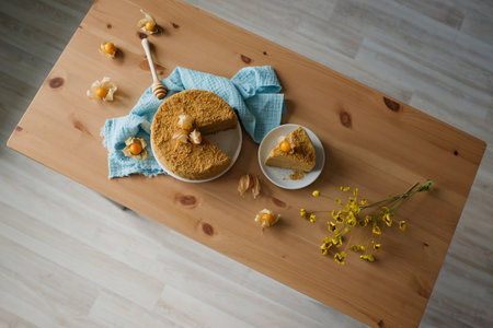 Slice of honey cake is sitting on a plate on a table in a cafe, illuminated by warm sunlight
