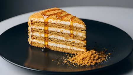 A slice of layered honey cake fits perfectly on a black plate, drizzled with golden syrup. The cake features multiple thin layers of sponge and cream, garnished with crumbs for texture.