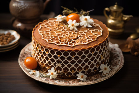 Cake with honey, walnuts, cinnamon and golden pearls isolated over wood background