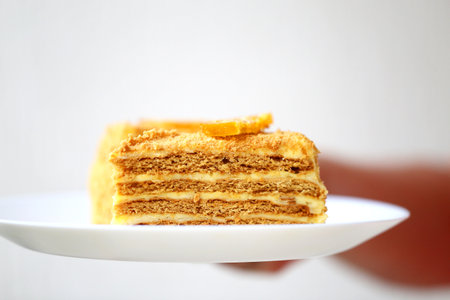 Cropped view of woman holding piece of honey cake on a white plate. Cut cake with visible layers and white cream.