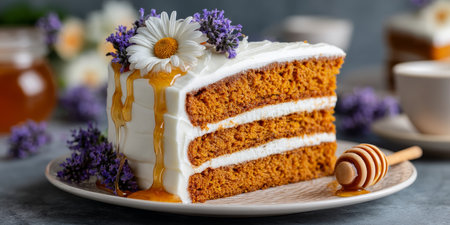 A slice of honey cake showcases its sweet, layered interior, garnished with delicate flowers and accompanied by honey on a soft, bright surface.