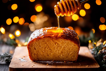 A golden loaf of bread sits on a wooden board while rich honey cascades over its top, illuminated by a warm bokeh of fairy lights, creating a cozy and inviting atmosphere.