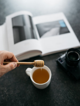 Cozy Morning Ritual with Honey Drizzled into Tea and Open Photography Book on Dark Stone Table
