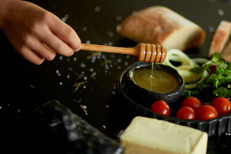 Tasty and healthy food. Black background, handmade pottery.Hand raises a spoon for honey. Honey flows down. Beautiful color